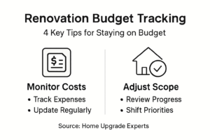 Implement a detailed tracking system, such as a spreadsheet, to compare actual expenditures against your initial budget. Schedule regular budget review meetings with your contractor to address any overruns or potential savings.